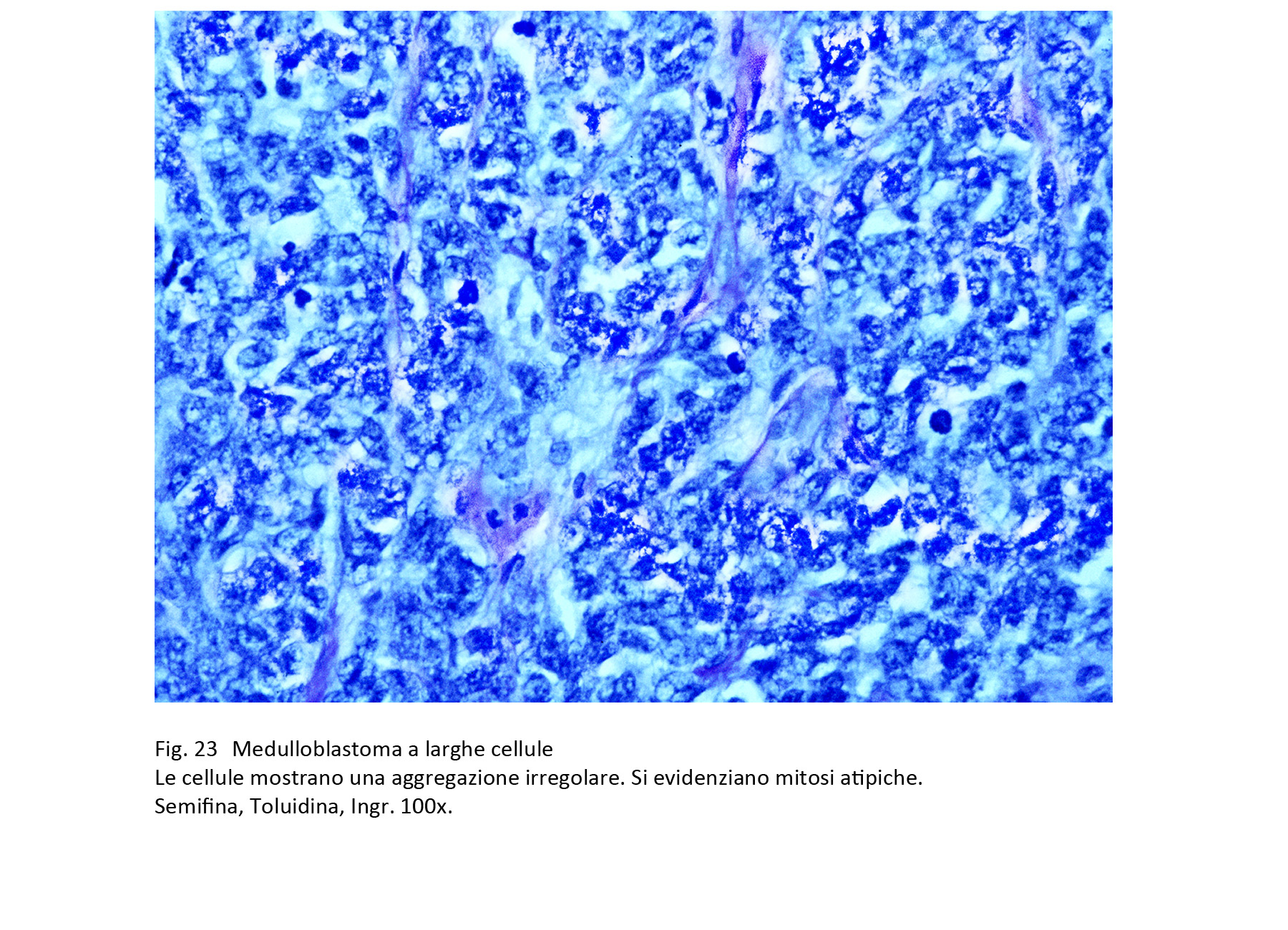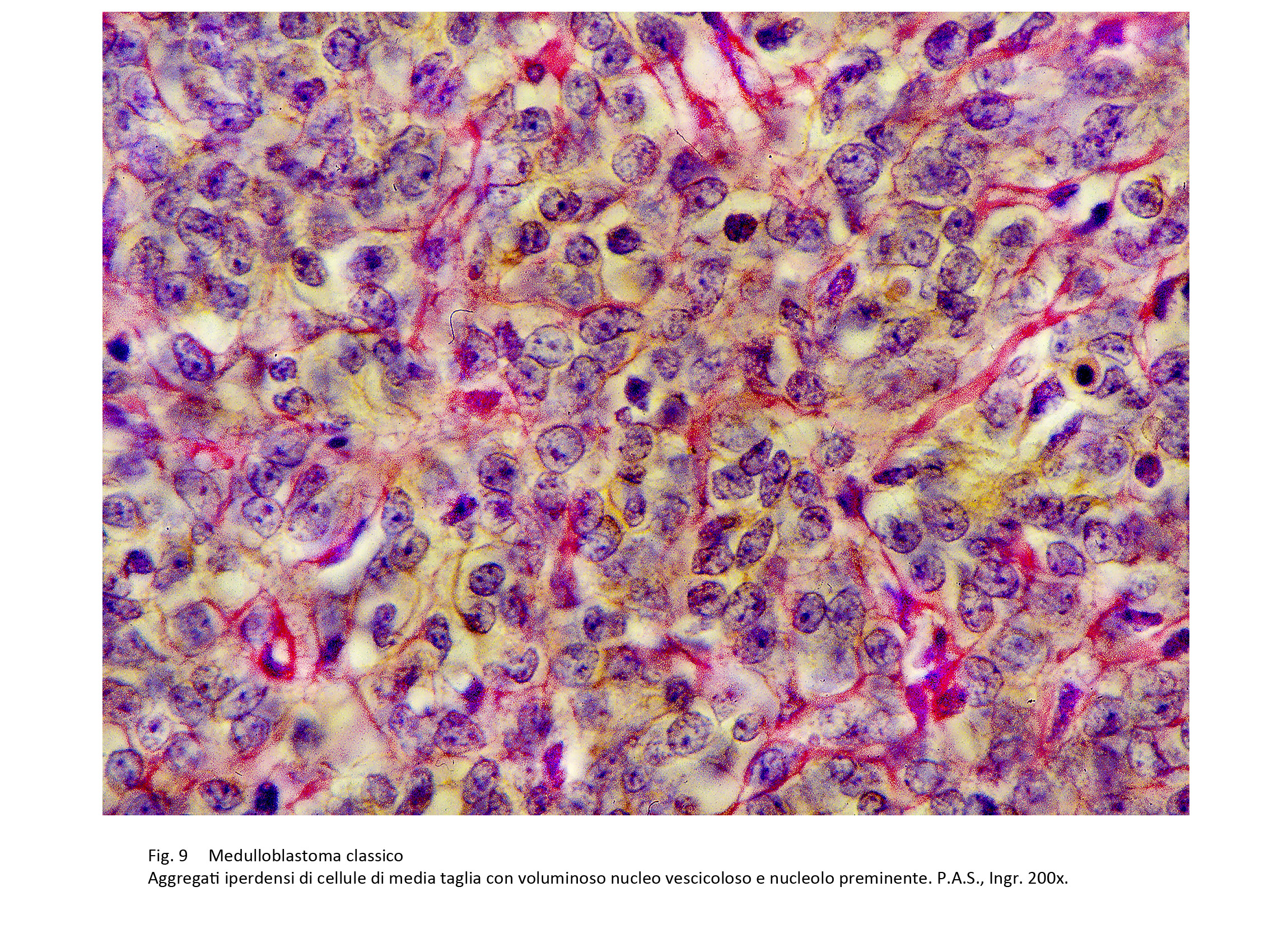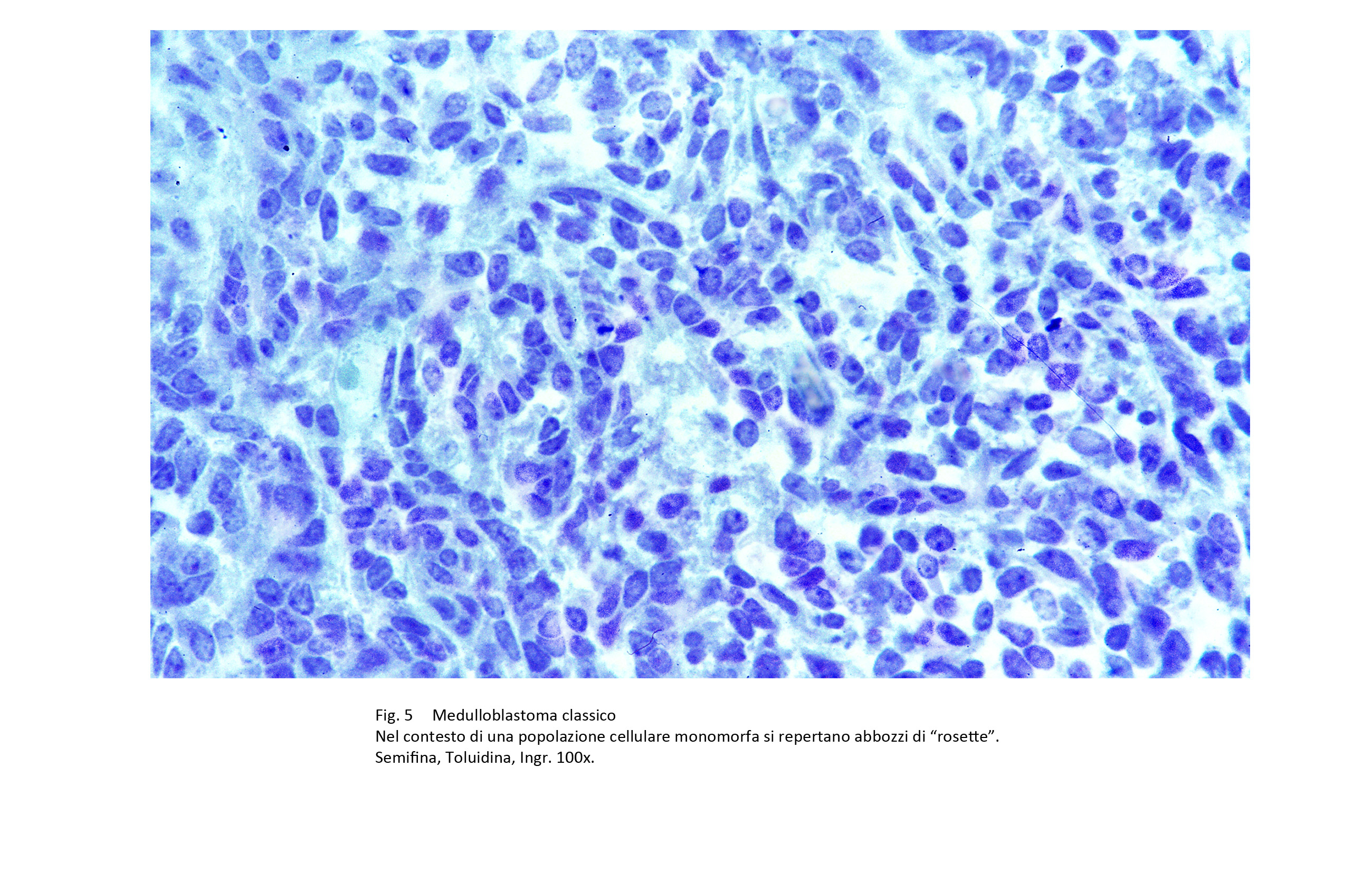 Il Medulloblastoma classico è un tumore ad alta densità cellulare, caratterizzato da un elevato indice proliferativo come si evidenzia anche dal riscontro di numerose mitosi tipiche ed atipiche. La sua micro-architettura presenta aspetti diversificati nei vari casi o da zona a zona nello stesso reperto anatomico.