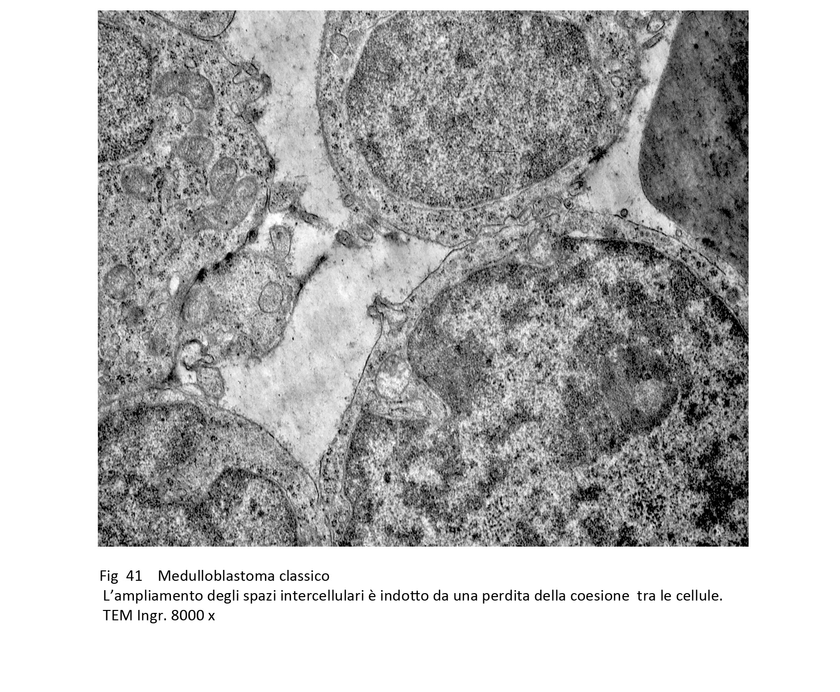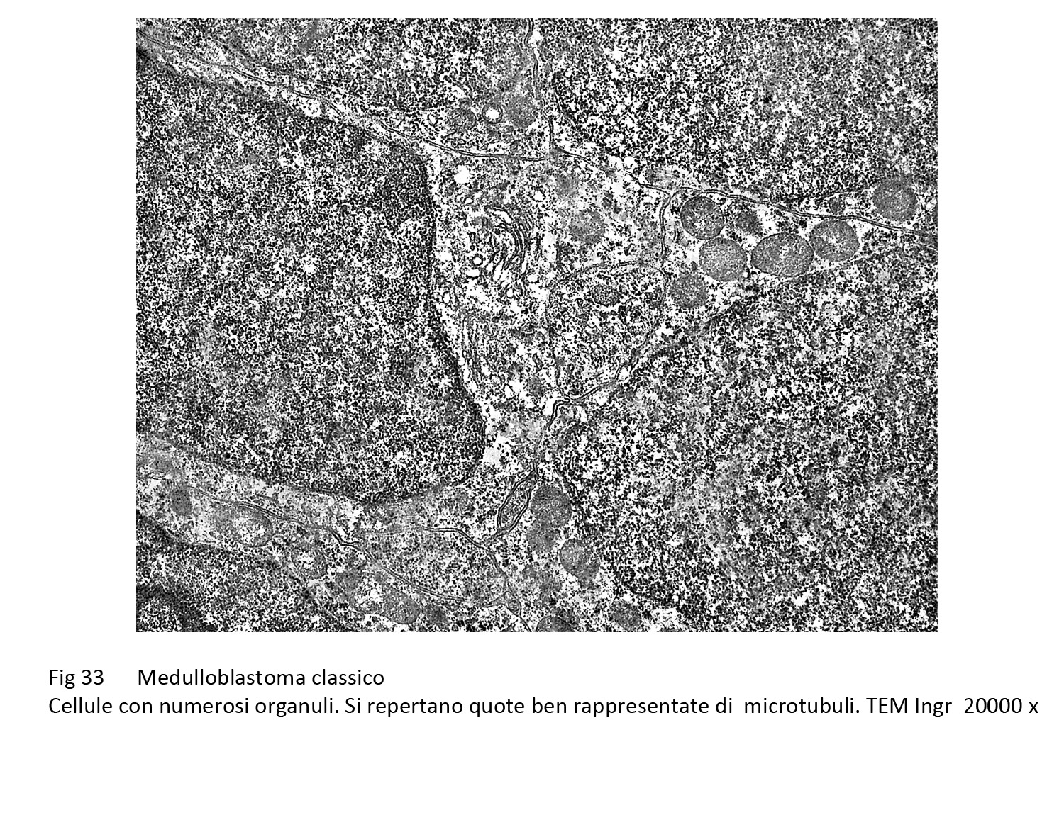 La microscopia elettronica consente di documentare le cellule medulloblastiche indifferenziate e di cogliere i diversi livelli di diffferenziazione delle stesse attraverso lo sviluppo delle sub-strutture e i prolungamenti del citoplasma.